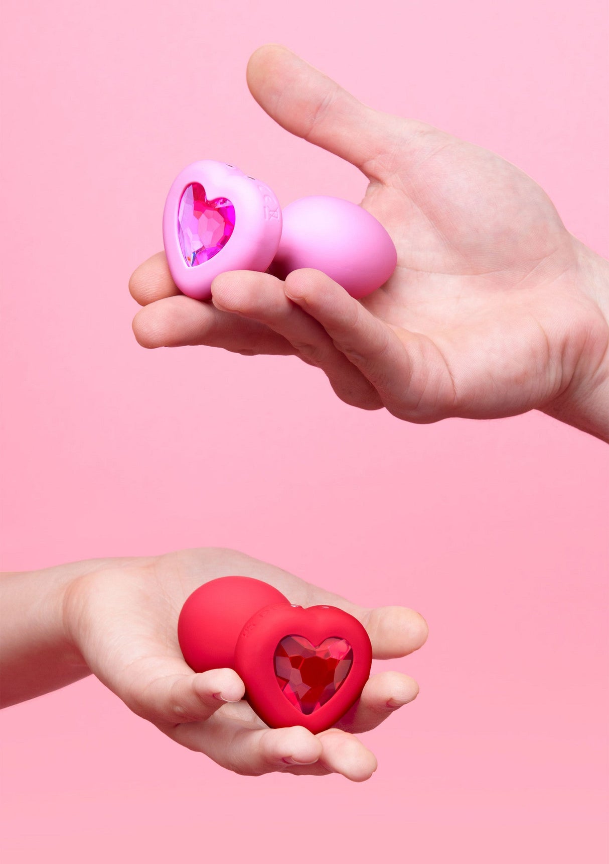 Ready to bling out your booty and vibe to your heart's desires? Say hello to the new b-Vibe Vibrating Heart Plug! Available in two sizes, the Vibrating Heart Plug is ideal for anyone that wants to add a touch of glamour to their anal play. With 15 vibration patterns and 6 pleasure intensities that range from soft pulsations to deep and powerful, the shimmering scarlet red and pink topaz plugs are the Tiffany's of anal. Featuring 6 levels of intensity, 15 vibration patterns, and an extra cute heart-shaped jewel base. Made from silky smooth silicone and a broad tapered base.