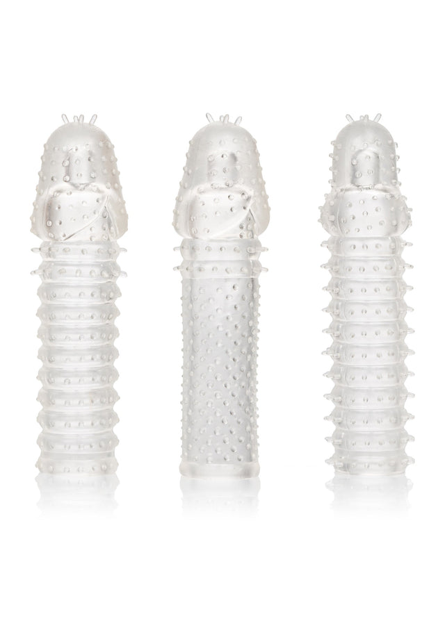The 3 Piece Extension Kit is a set of 3 super tight, close-end extension sleeves with a ribbed texture inside and out for intense stimulation. These enlarging enhancer sleeves wrap tight to increase girth, length and explosive pleasure for everyone involved. The erotic enhancer sleeve’s ultra stretchy material and spacious chamber is made to fit even the biggest man. While you thrill your lover with increased girth and stimulating ticklers, the fulfilling enhancer’s powerful erection support and textured chamber result in explosive results for both of you. The textured chamber and erection enhancer provide increase stimulation and powerful support. Wrap your pleasure tool in this super stretchy sleeve to easily increase stamina, stimulation and orgasmic pleasure. The flexible enhancer is made from a hygienically superior TPR. This body safe material is unscented and phthalate free to keep your most sensitive spots happy and healthy
