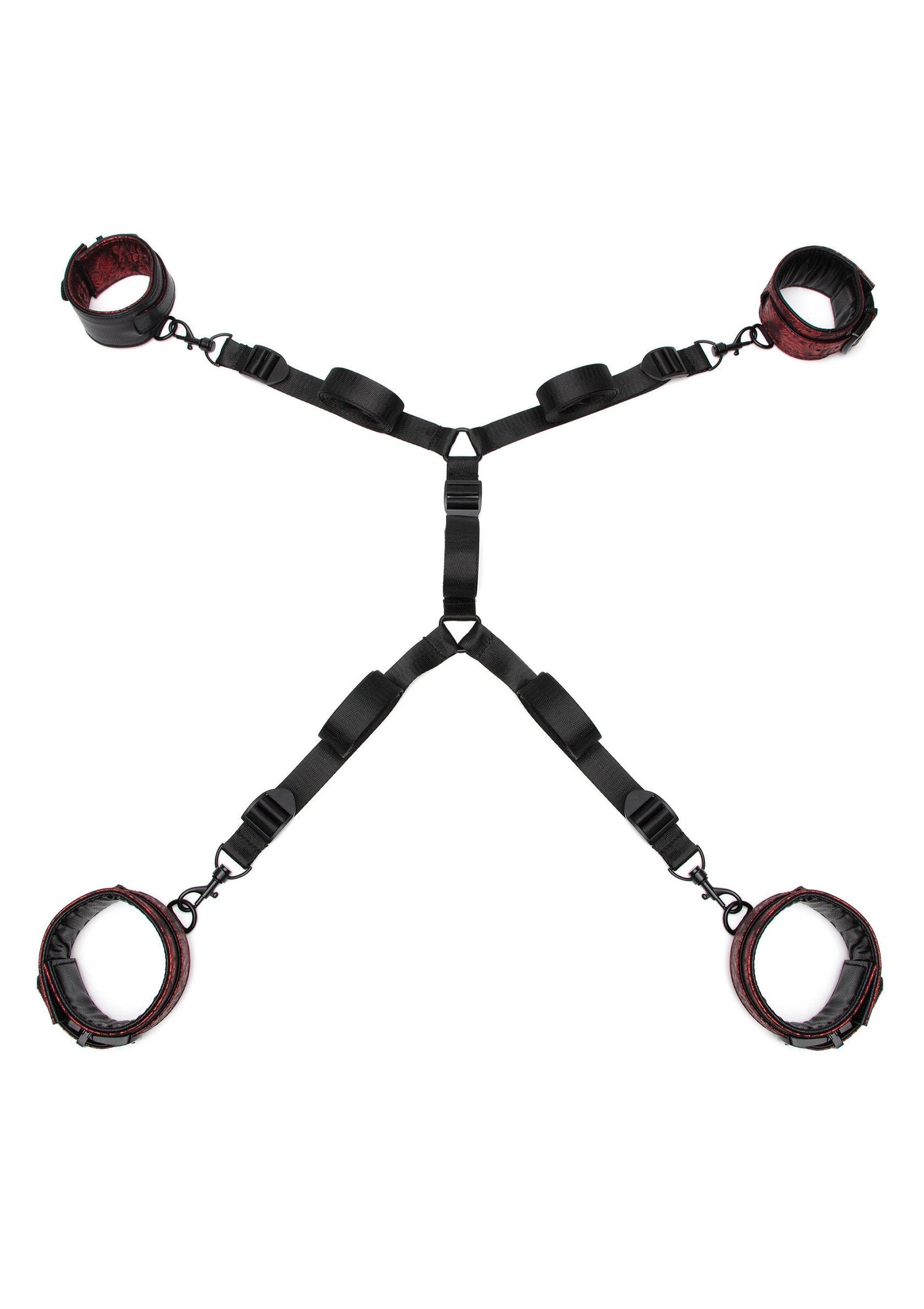 Four faux leather cuffs with soft padding and six-hole buckle fastenings ensure pure comfort and complete restraint in an instant, as the set cuffs your sub's arms and legs and leaves them bound and vulnerable in your power.