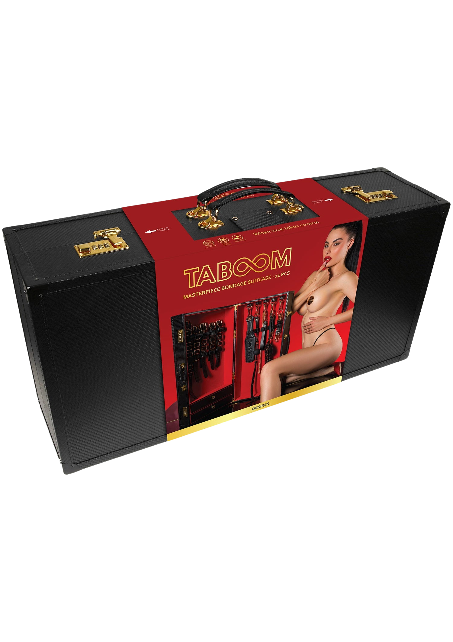 Unlock your deepest fantasies with TABOOM Desires Masterpiece Suitcase – a unique collection of 11 exquisite bondage essentials designed for couples ready to explore new heights together. Inside the eye-catching suitcase, you'll find a seductive collar with leash, elegant handcuffs and wrist cuffs, a sensual blindfold, teasing ball gag, smooth paddle, alluring nipple covers, and a BDSM drip candle to heat up every moment.