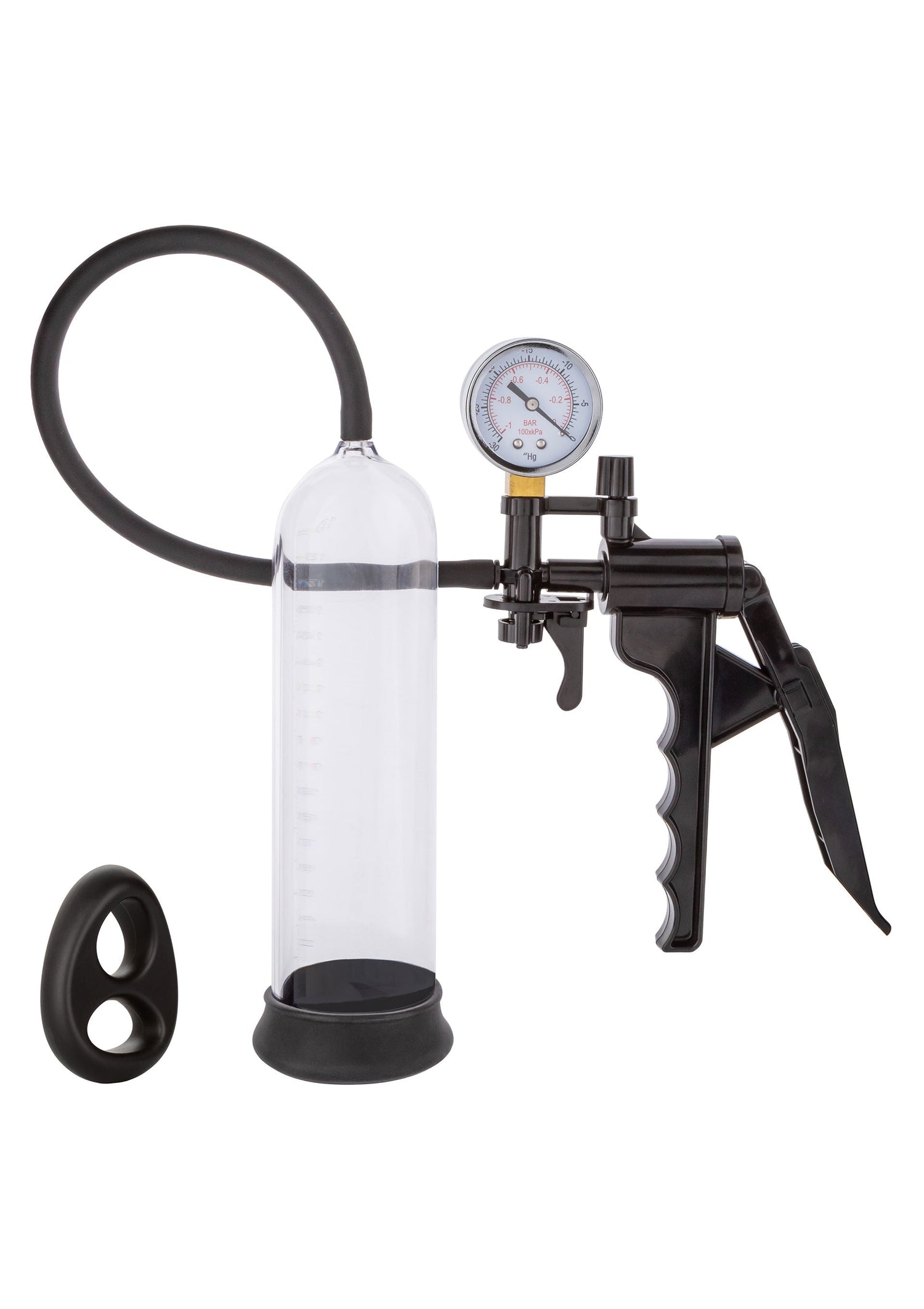 Das Magnified Gauged Pump System besteht aus einer Druckpumpe und einem doppelten Verstärkerring aus Flüssigsilikon mit Hahn und Kugel. Die Pumpe hat ein eingebautes PSI-Manometer für eine sichere Druckkontrolle und einen vergrößerten Zylinder mit Messmarkierungen, um den Fortschritt zu verfolgen. Sie verfügt über einen flexiblen Luftschlauch, einen leicht abzudrückenden Pistolengriff und ein Druckablassventil zur schnellen Entlastung. Der konisch zulaufende Silikondonut verbessert den Komfort und sorgt für eine gute Abdichtung. Die Pumpe lässt sich zur einfachen Reinigung zerlegen. Ein komplettes Set zur Leistungsunterstützung und zusätzlichen Verbesserung.