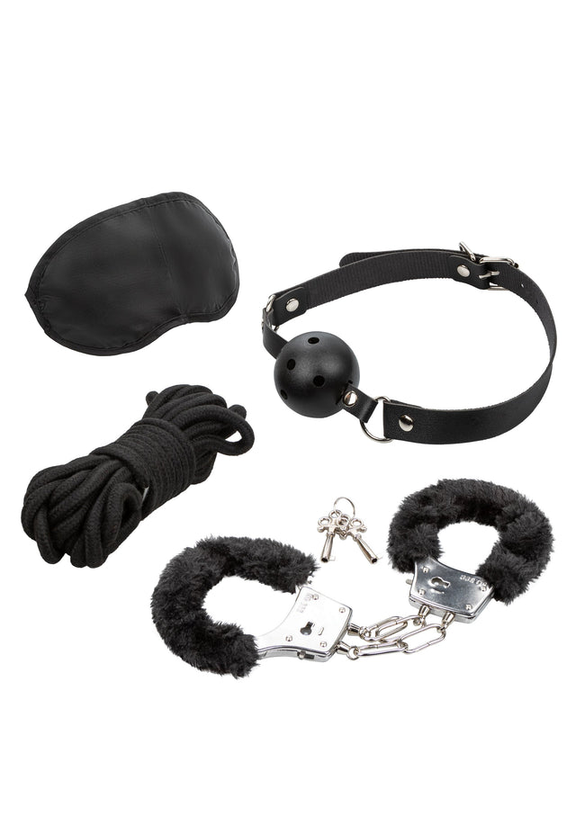 The Explorer Collection is a bondage starter kit with a breathable ball gag, stretch-to-fit eye mask, faux fur cuffs, and 5 m rope. The ball gag has an adjustable buckle for a secure fit. The eye mask fits most sizes and helps increase anticipation. The cuffs are soft and removable, and include a safety release and two keys. The rope gives many options for playful restraint. A great kit for beginners who want to explore role play, control, and new sensations safely.